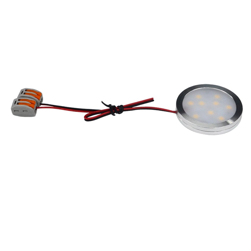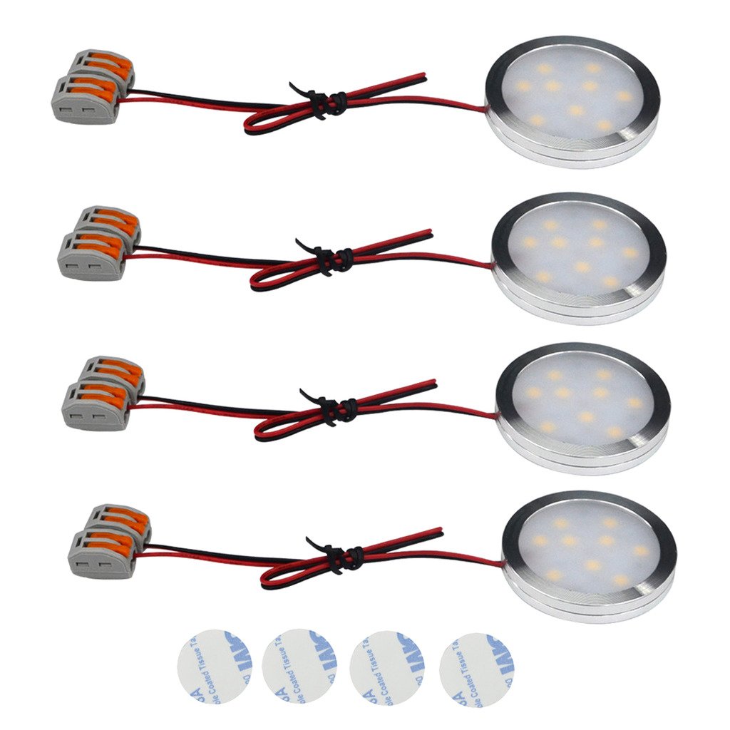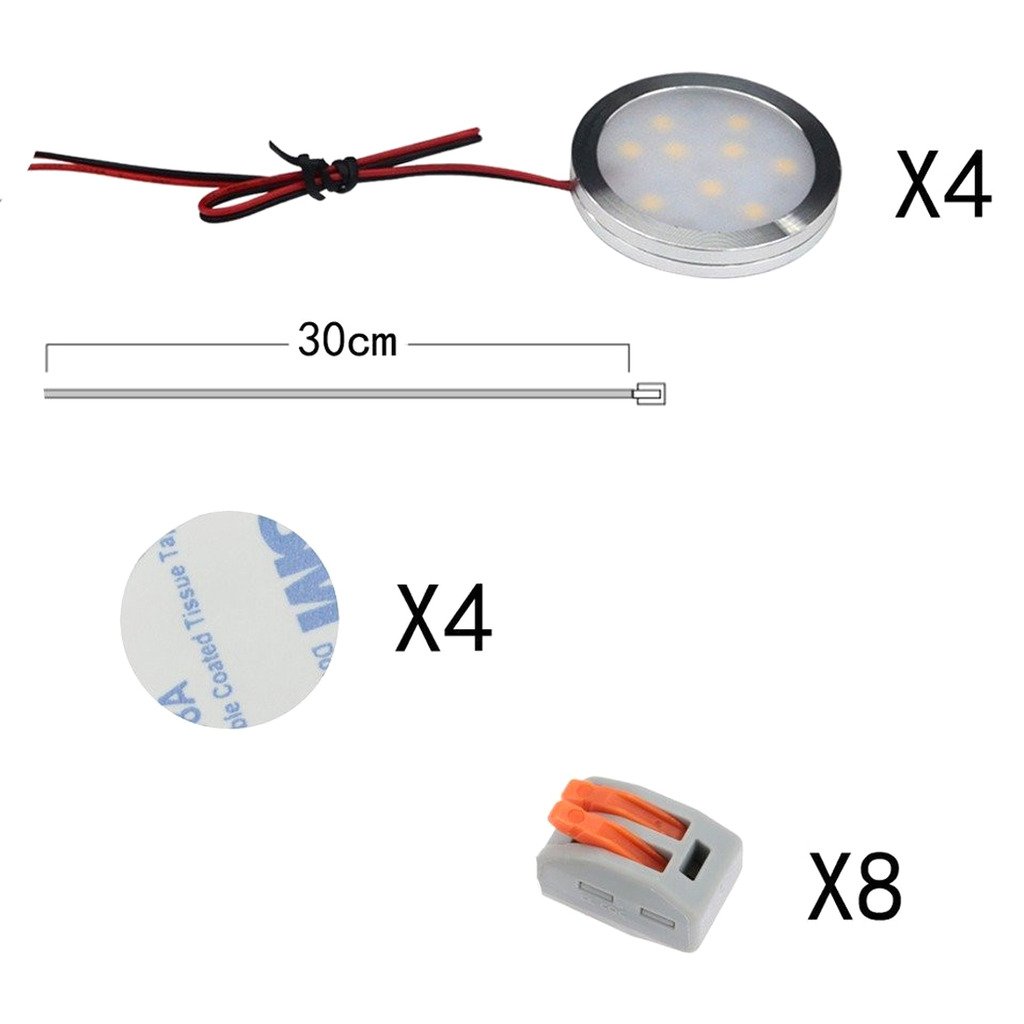 12V Direct Wired Under Cabinet LED Lighting Kit 4 Packs of Aluminum Slim Puck Lights DIY Wiring for Kitchen Furniture TV Shelf Back Lighting with 30cm Red + Black Blank Wires.