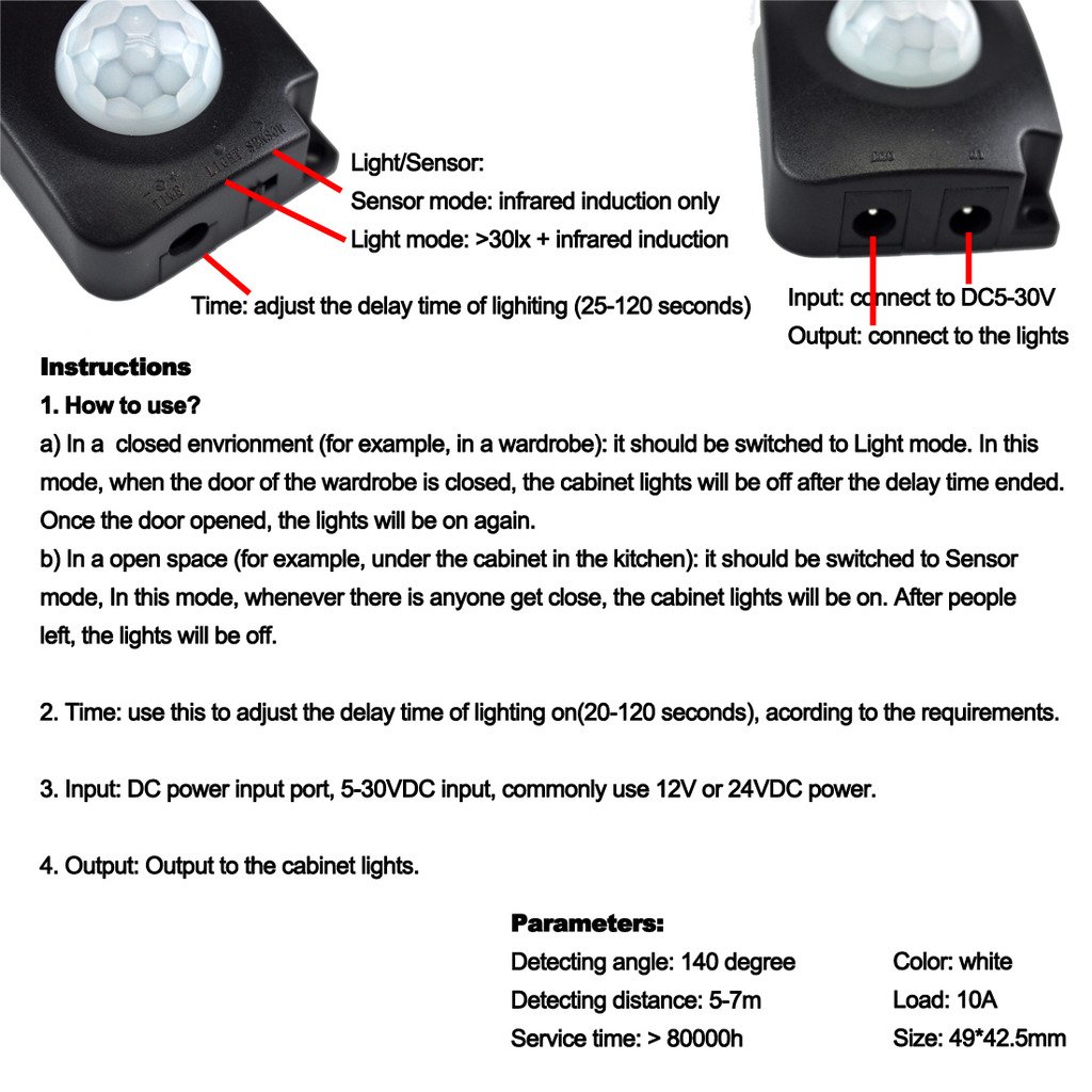 b) In an open space (for example, under the cabinet in the kitchen): it should be switched to Sensor mode, In this mode, whenever there is anyone get close, the cabinet lights will be on. After people left, the lights will be off.