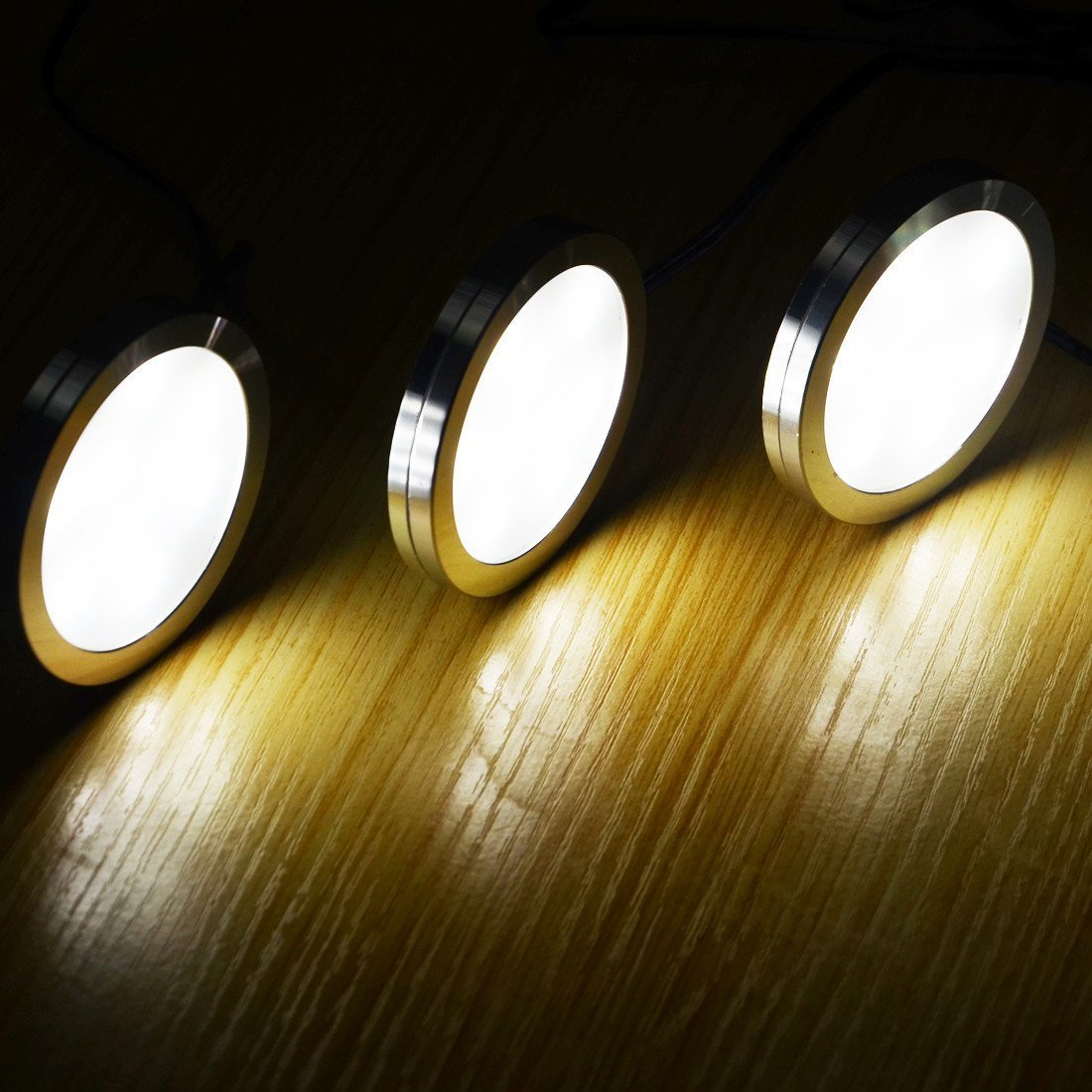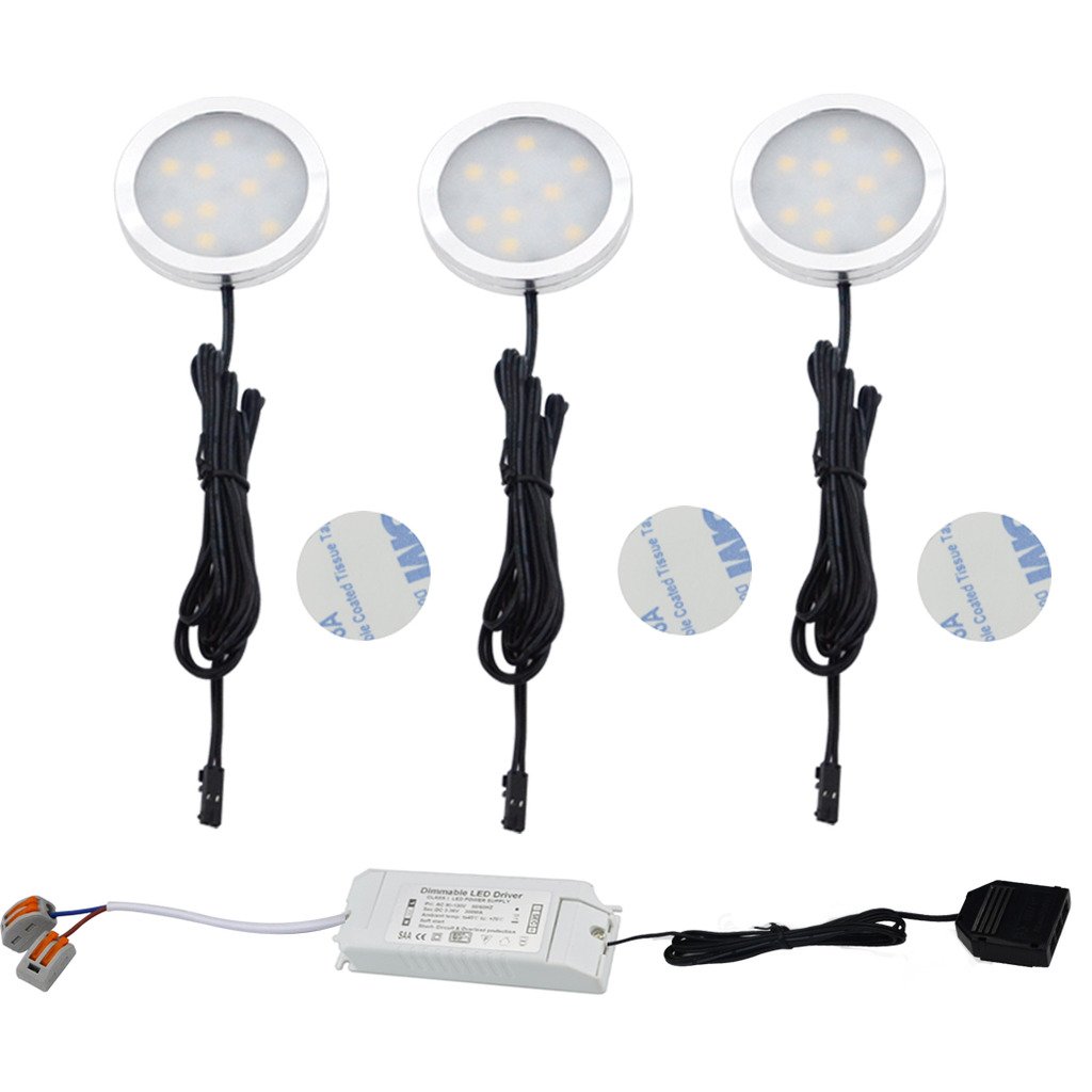 LED Under Cabinet 3 Puck Lights Set 90-130V Triac Dimmable with Hard Wired External Driver for Home Kitchen Closet Accent Lighting(Day White,6W)
