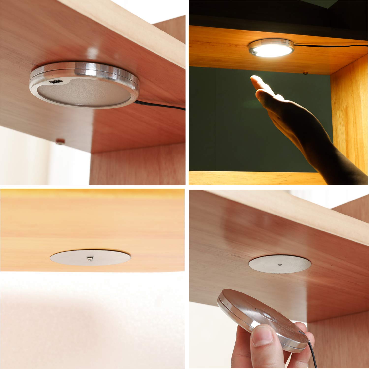 • @LARGER SIZE AND BRIGHTER: Ultra thin cabinet lights, LED hand wave activated light with 3.15 inch diameter, almost don't see it after finished installation, each of cabinet puck lights has 450 lumen, the whole cabinet lighting kit offers you 2700 lumen along with CRI over 90, 4000K Natural white color, all the spec best support your daily illumination request for kitchen cabinet lighting and any other counter lighting.